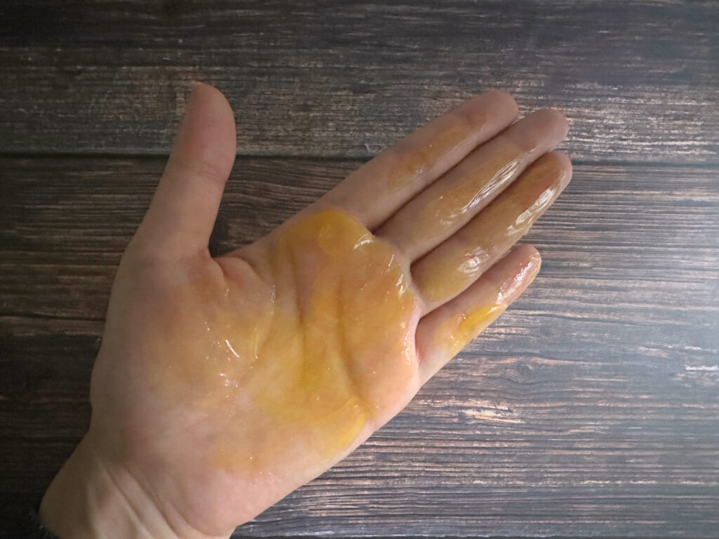 最初に出した時はとろっとしたジェル状。手に広げるとスーッと伸び、顔全体を優しく包み込む感じです。